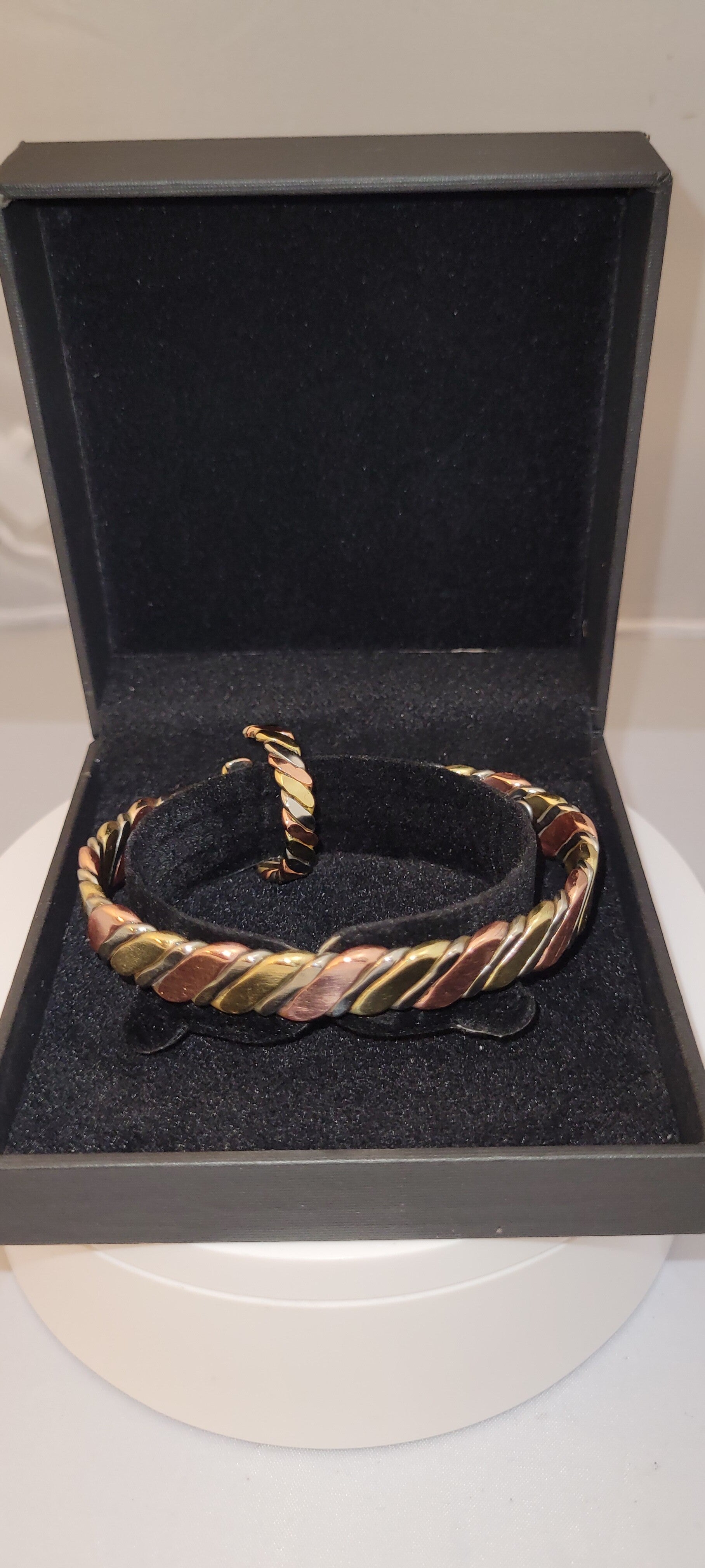 9% pure copper with 6 Neodymium magnets in the bangle and 2 more in the ring. (Neodymium magnets have potential health benefits and are used in alternative medicine for pain relief, improving circulation, and stimulating bone formation)