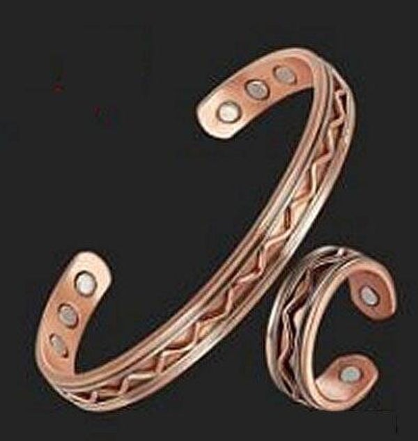 6 strong Neodymium magnets in the bangle and 2 more in the ring. (Neodymium magnets have potential health benefits and are used in alternative medicine for pain relief, improving circulation, and stimulating bone formation)
