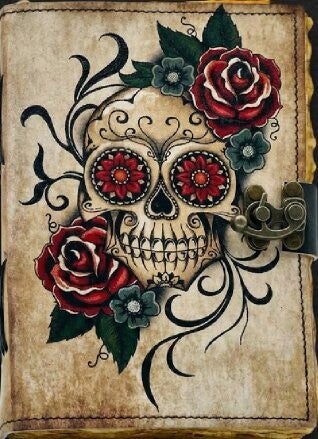 New larger size, now 8" x 5" x 2" thick (A5) portraying the "Calavera" or Sugar Skull on the front and back of this primarily cream journal.
