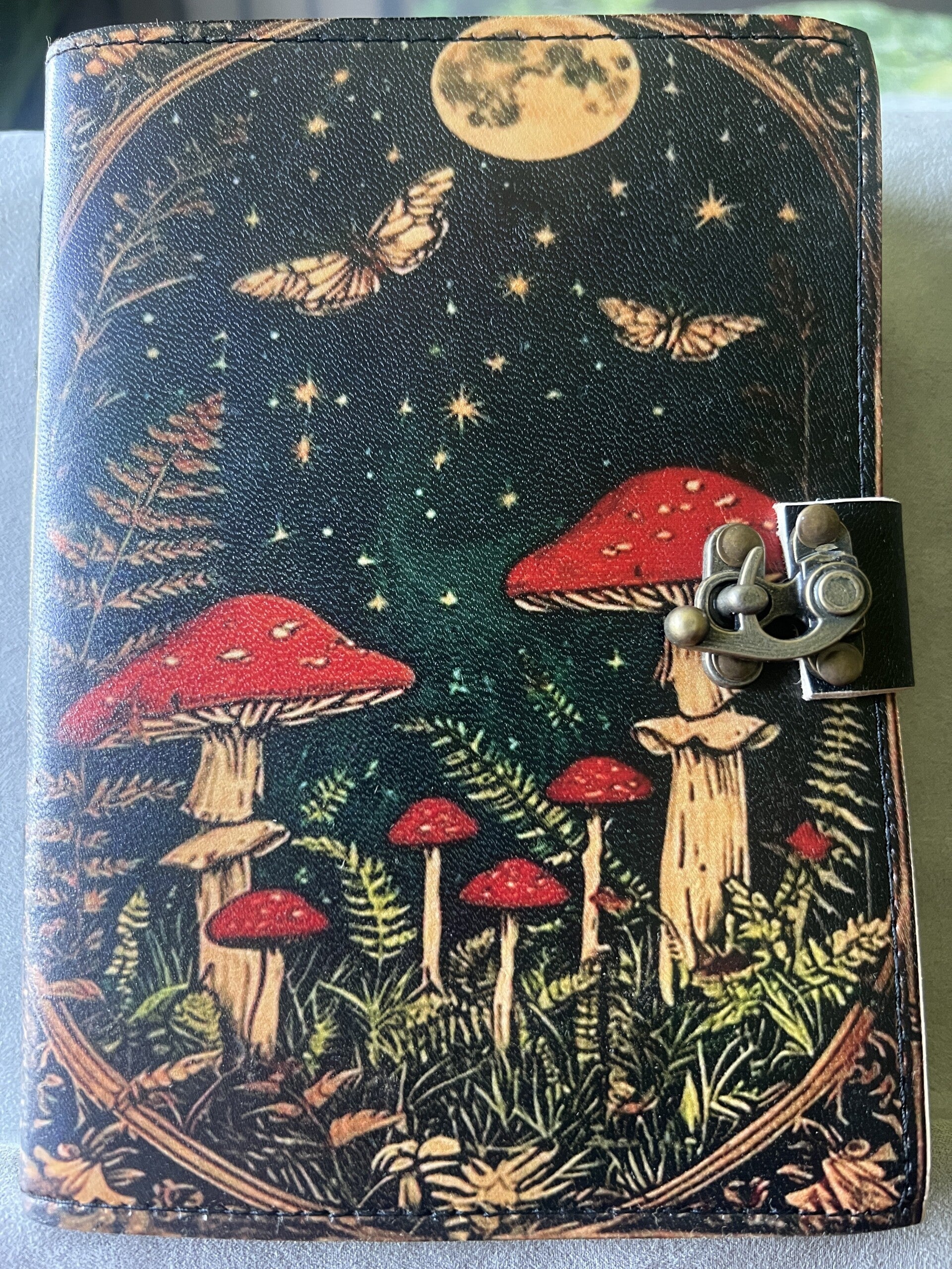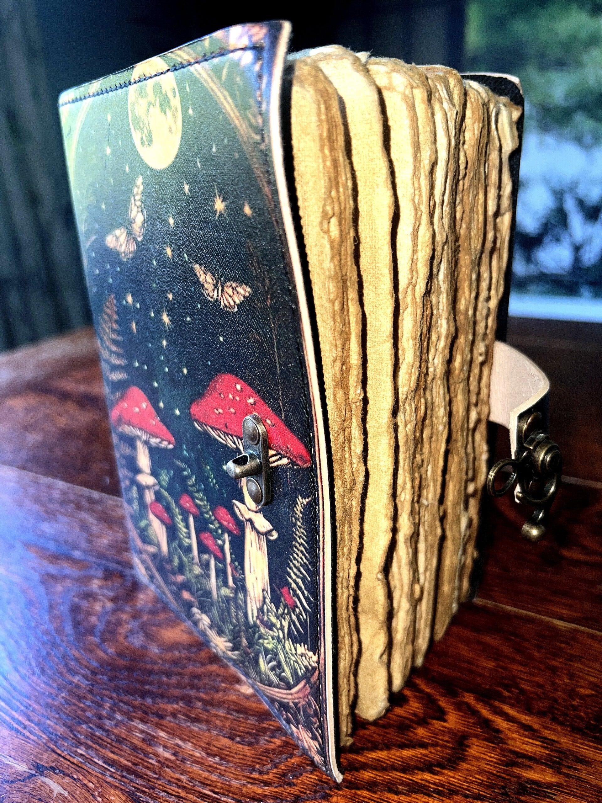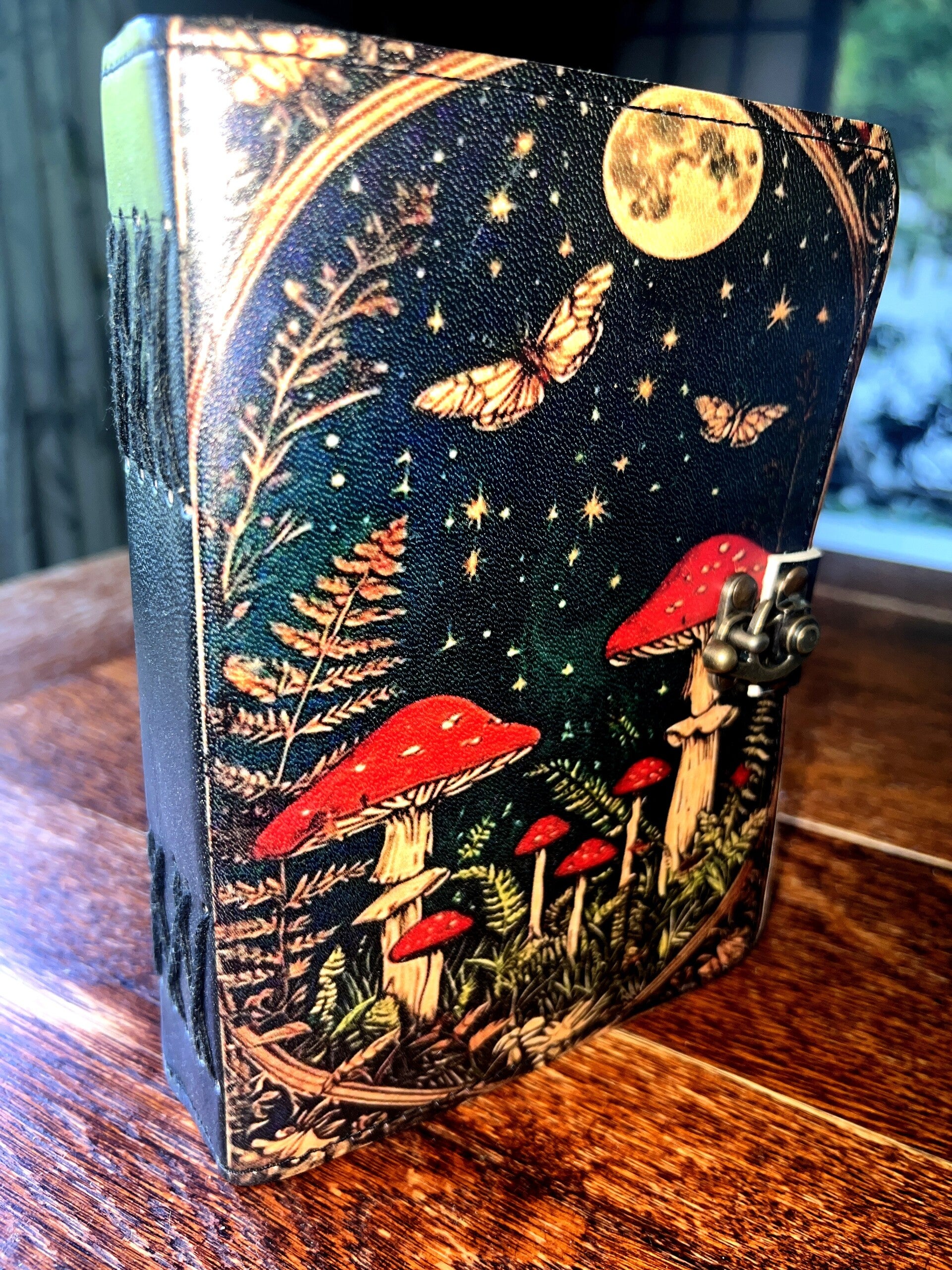 This is a vintage-style leather journal featuring a mystical mushroom and celestial illustration on the cover. These types of journals are often sold as "Grimoires" or "Books of Shadows" and are popular for their cottagecore and witchcraft-inspired
